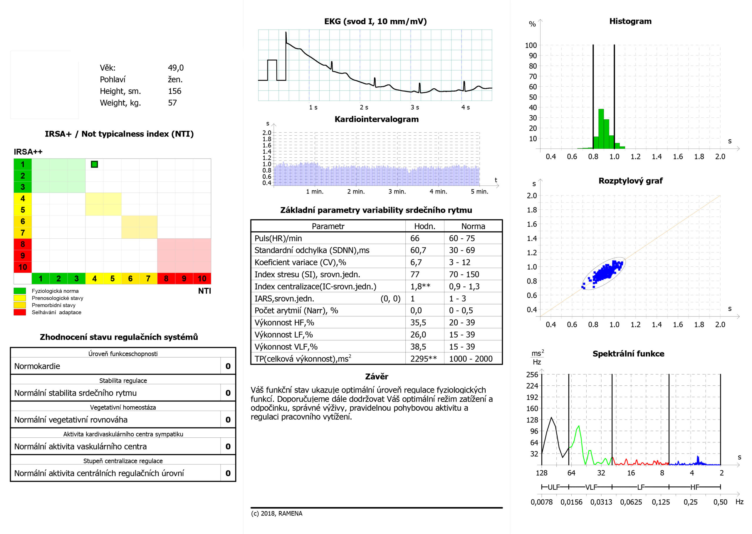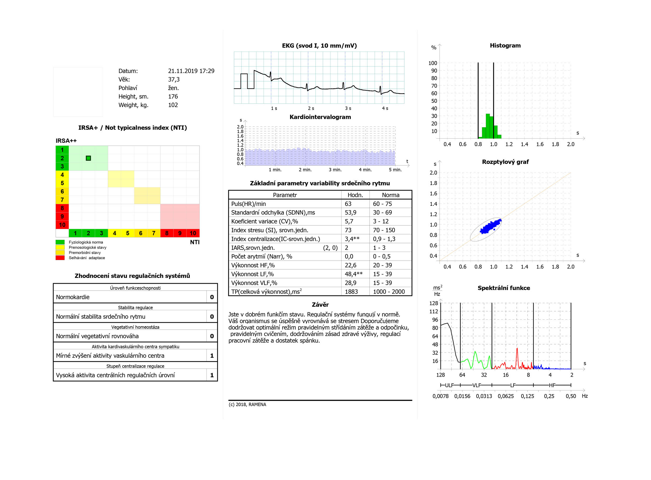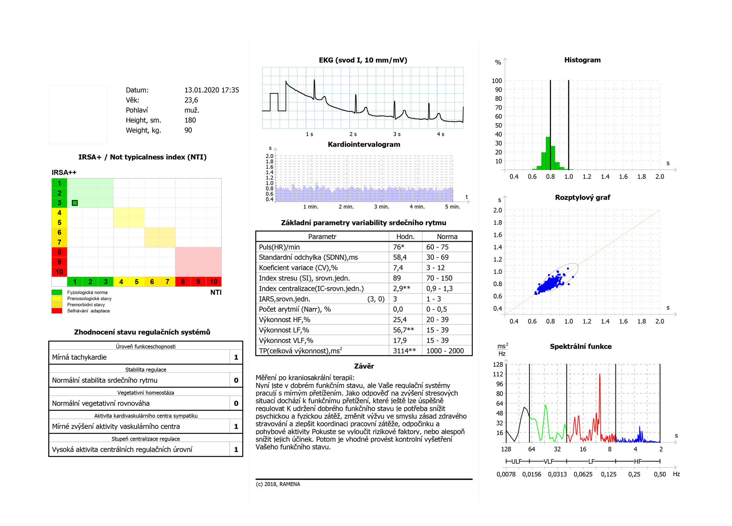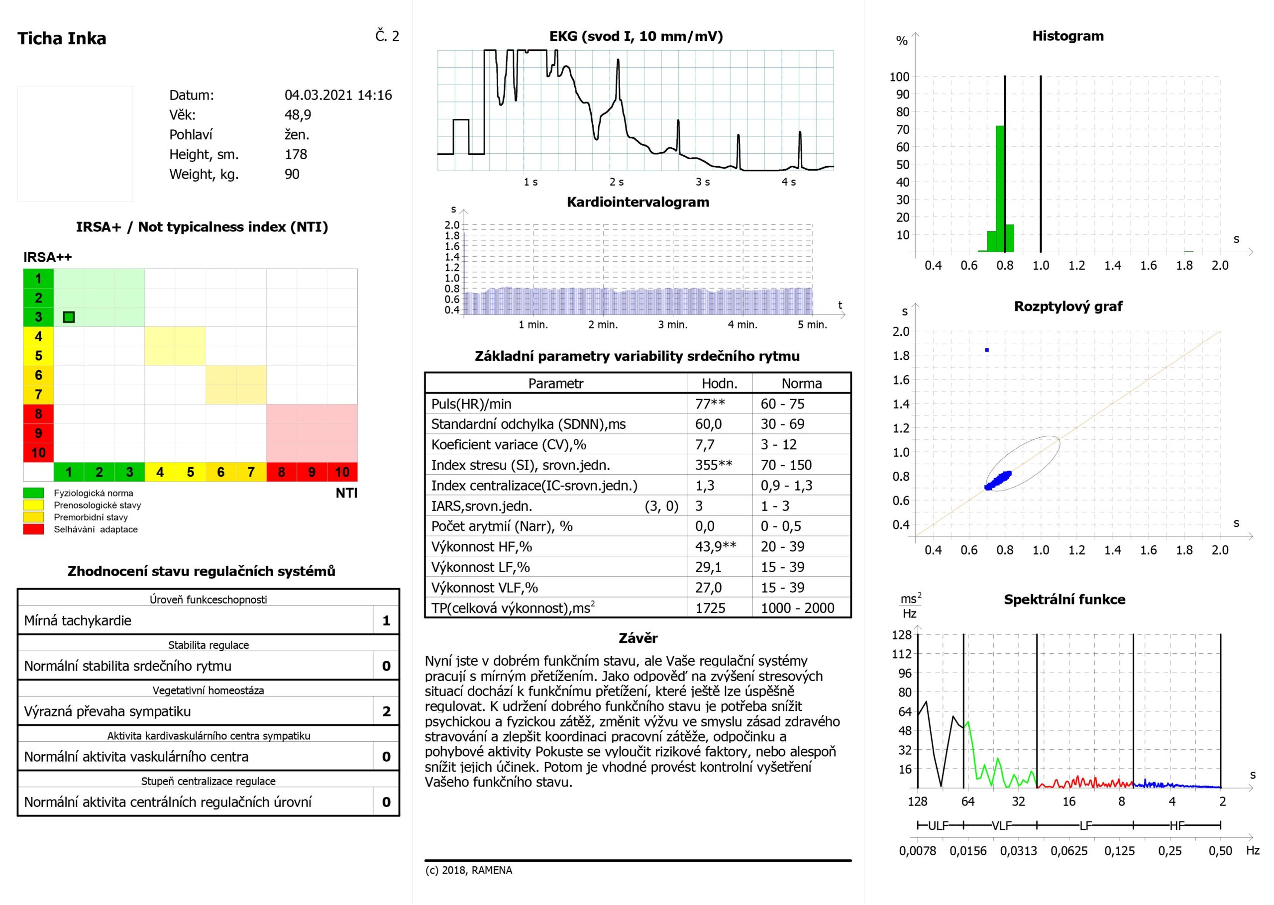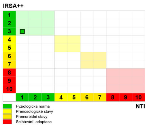 Zrychlený puls, převaha sympatiku – krizové řízení, index centralizace vysoký, nulové rezervy, veškerá energie jde hned do spotřeby. Velké vyzomotorické napětí na cévách, velká zátěž pro kardiovaskulární systém, zatím bez vysokého tlaku, ale tento člověk talkuje zevnitř, pod povrchem, velké vnitřní napětí a boj sám se sebou. Vzhledem k věku ještě dobrá adaptace.