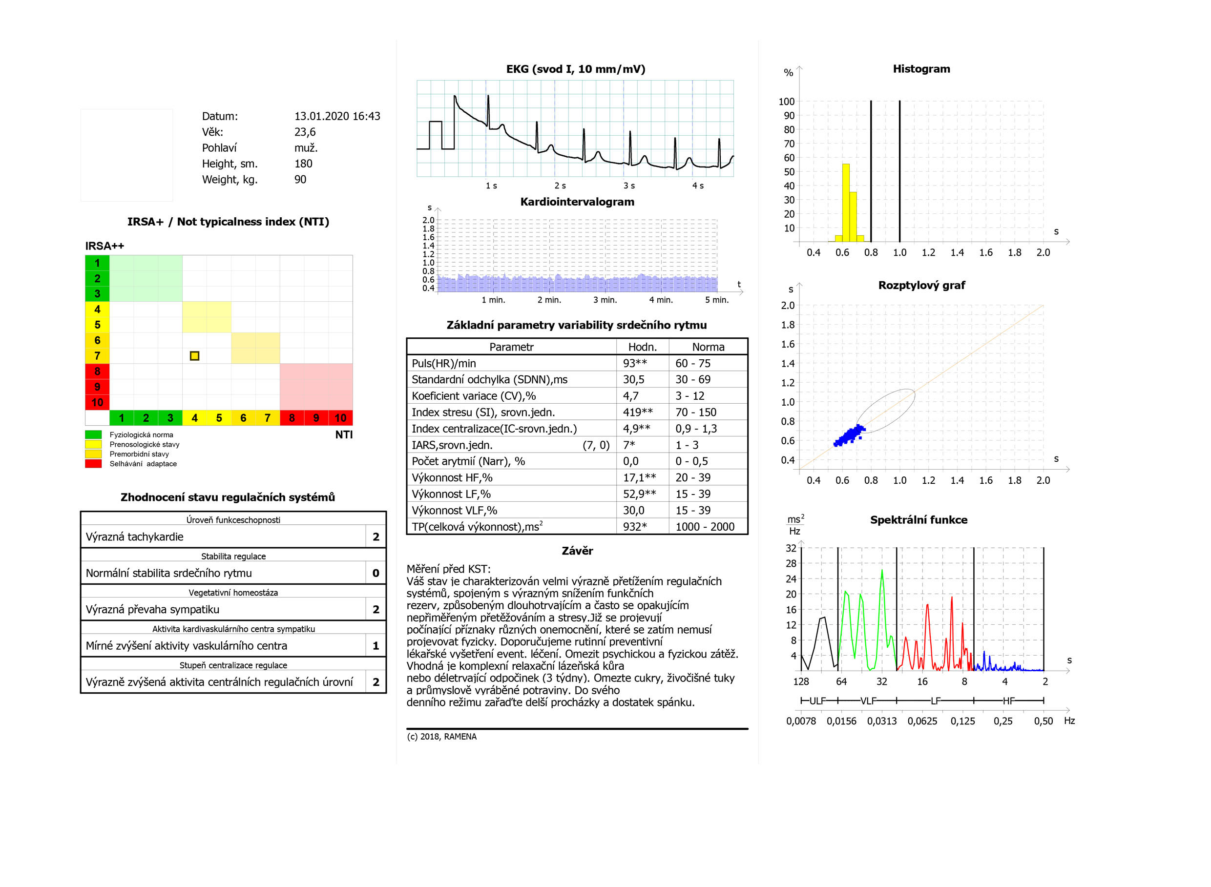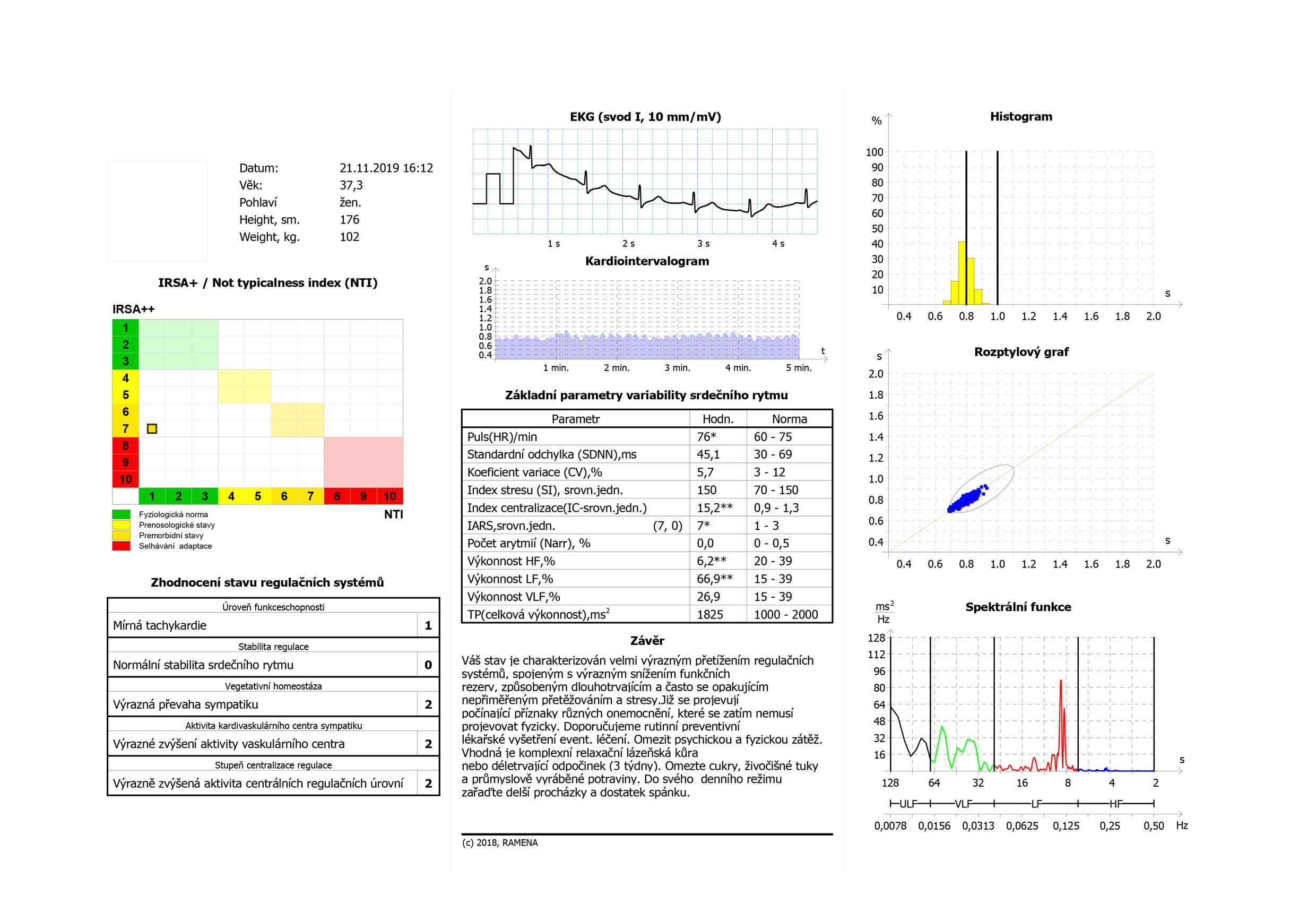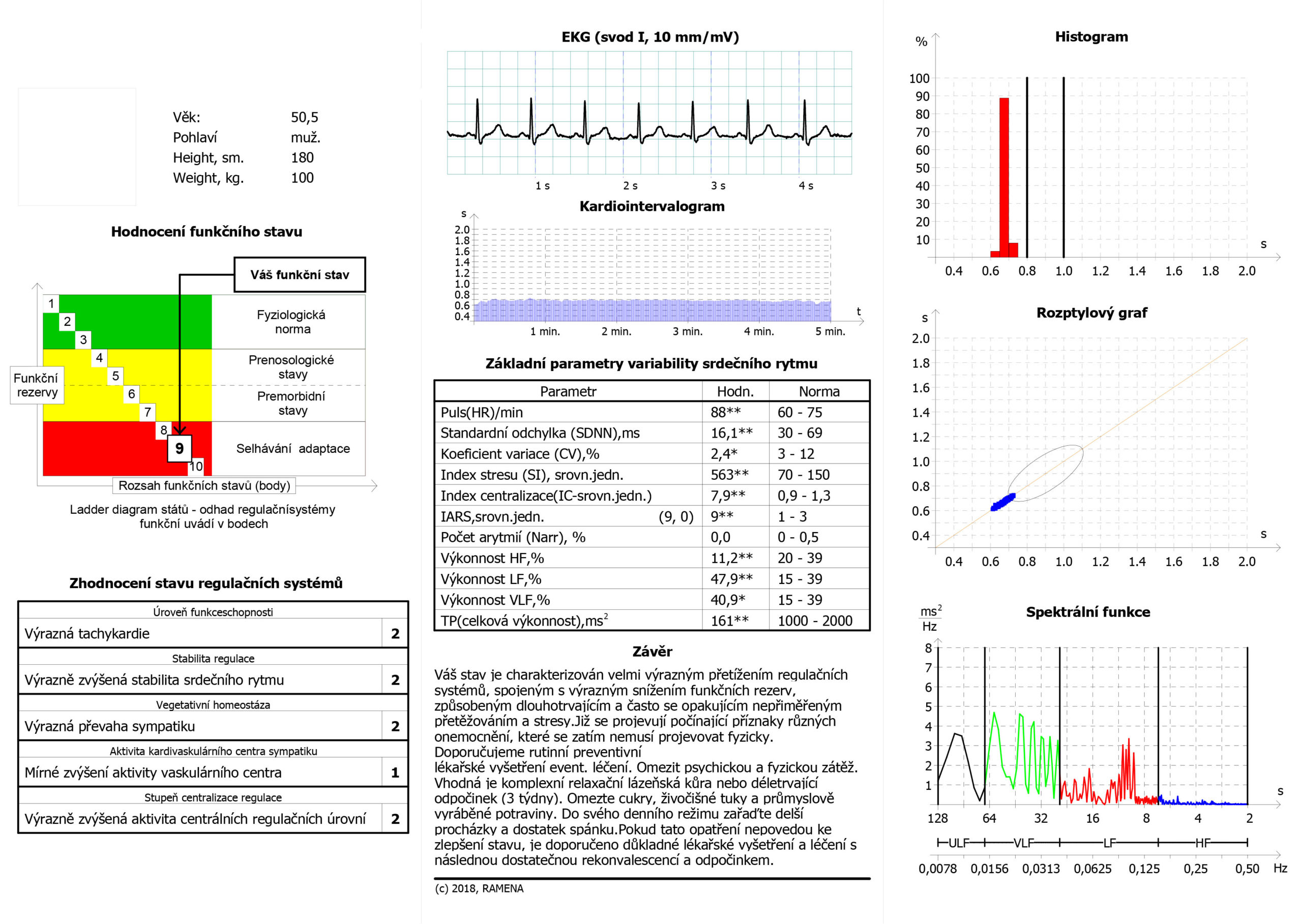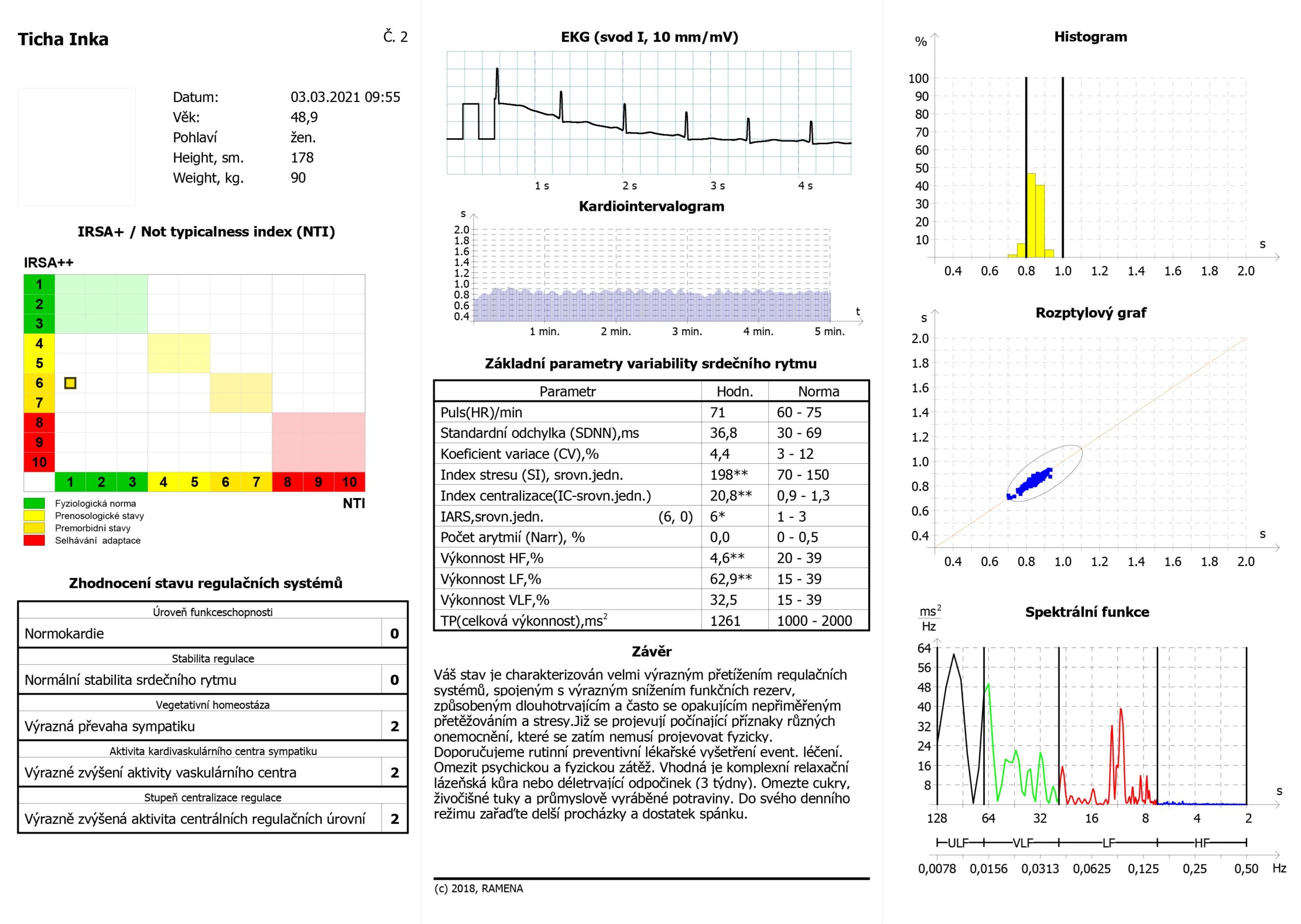 Tady můžete vidět dlouhodobě přetížený organismus pod dlouhotrvajícím tlakem. Tento člověk je trvale v režimu bojuj nebo uteč, je trvale ve stavu aktivace a pohotovosti. Zvýšený srdeční tep ukazuje, že systém potřebuje stále velký přísun kyslíku, tzn. energie, SDNN je hluboce pod normálem, takže variabilita je minimální, IS je vysoký, což odpovídá výrazné aktivaci sympatiku, Index centralizace je vysoký – tento člověk už je ve stavu totálního řízení rezerv shora (CNS) , rezervy žádné, vazomotorické napětí v kardiovaskulárním systému enromní a hormonální aktivace HPA osy taky nad normou. TP – celková výkonnost je výrazně pod normálem, pouze 161 (1000-2000 je optimum). Tento fyziologický stav se již projevuje řadou nemocí, včetně vysokého tlaku, cukrovky atd.
